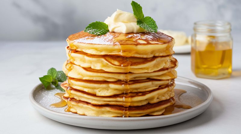 برای تهیه پنکیک صبحانه، تخم‌مرغ، شکر، وانیل و روغن را مخلوط کنید. آرد، بیکینگ‌پودر و نمک را الک کرده و به مواد اضافه کنید، سپس شیر را کم‌کم افزوده و هم بزنید تا مایه‌ای یکدست حاصل شود. تابه را چرب کرده و مایه را در آن بریزید. پس از ایجاد حباب روی سطح، پنکیک را برگردانید تا دو طرف طلایی شود. همه پنکیک‌ها را به همین روش بپزید و در نهایت با میوه، عسل، نوتلا یا مربا تزئین و سرو کنید.